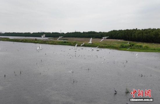 近日,记者在广州南沙湿地看到,这里红树成林连荫,千亩滩涂绵延,大批鸟类在低空盘旋,或栖息于树上、或在浅滩上觅食,铺开了一幅人与自然和谐共生的美丽画卷。