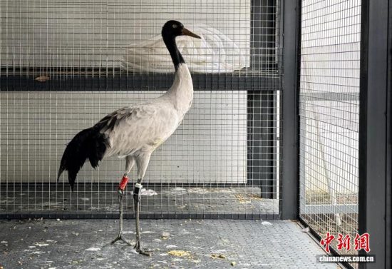 图为救助康复的黑颈鹤脚上戴上了追踪器。 纳帕海管护局 供图