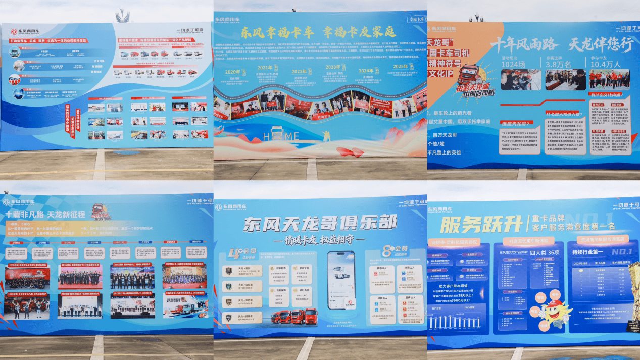 此次升级,不仅是IP焕新,更是一次文化的深度沉淀与服务的全面升维。现场精心构筑的东风文化空间,以墙为卷、以文为脉,系统传递着东风商用车的底蕴与未来。迎面而来的「东风文化墙」,镌刻东风商用车的根脉与灵魂,记录从制造到创造价值的每一步;紧随其后的「幸福卡车」承载愿景与温度,让钢铁机器成为幸福空间;旁边的「天龙哥历程」闪耀着荣耀与情谊,见证卡友从高手到意见领袖的蜕变;紧接着「天龙哥权益」彰显东风商用车对用户的诚意与行动,为俱乐部成员定制专属支撑;最后,「后市场服务」延伸品牌的责任与关怀,构建全周期一站式保障。