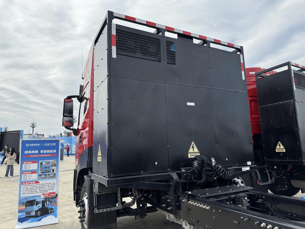 现场最瞩目的焦点,无疑是两款东风天龙KL 400kWh充换电一体新能源牵引车,它们与东风天锦KR载货车、东风天龙KX王者版630马力燃气牵引车等传统能源主力并肩,共同组成了一支无懈可击的全场景产品矩阵。