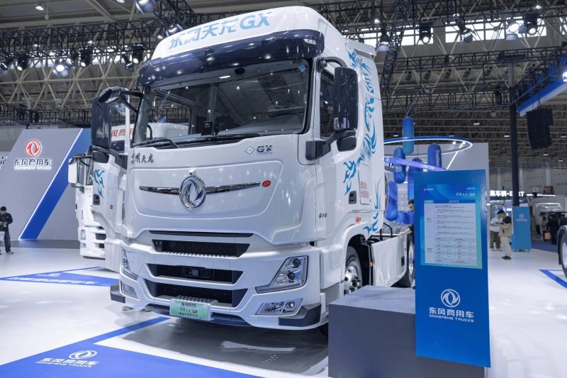 一旁的东风天龙KX双擎混动牵引车则展现场景适配能力,通过智能感知系统完成坡度自适应制动,印证了“安全与经济共生”的研发理念。