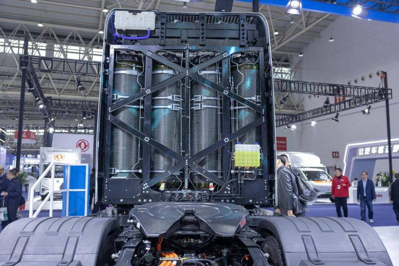 同样引人注目的东风天龙GX氢燃料电池牵引车则展示了东风在终极清洁能源技术上的前瞻性。其采用氢燃料电池技术,燃料电池功率达190kW,配备4个70MPa高压储氢瓶,总储氢量56kg,可实现超700公里的长续航,且加氢时间仅需20分钟,媲美传统燃油车。安全性上,它严格满足欧洲ECE-R134和GSR2法规,通过氢系统逃逸格栅、防静电设计等实现了全场景用氢安全。
