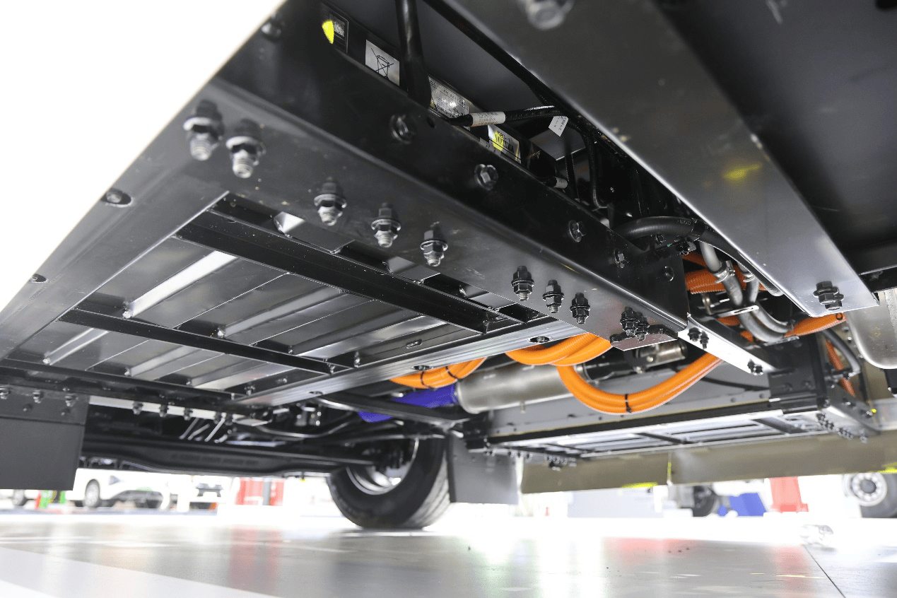 氢燃料电池牵引车本质上其实还是个电车,而为了优化底盘布局,提升车辆传动效率,东风天龙GX氢燃料电池牵引车采用了大功率电驱桥的配置。驱动形式用的是欧洲人喜欢的4X2,但是东风用的是单桥双电机的解决方案,单电机额定功率205kw,峰值功率265kw,双电机的峰值功率最大可达720马力,对于用惯大马力车型的欧洲用户而言,这个动力也是第一梯队的体验了。