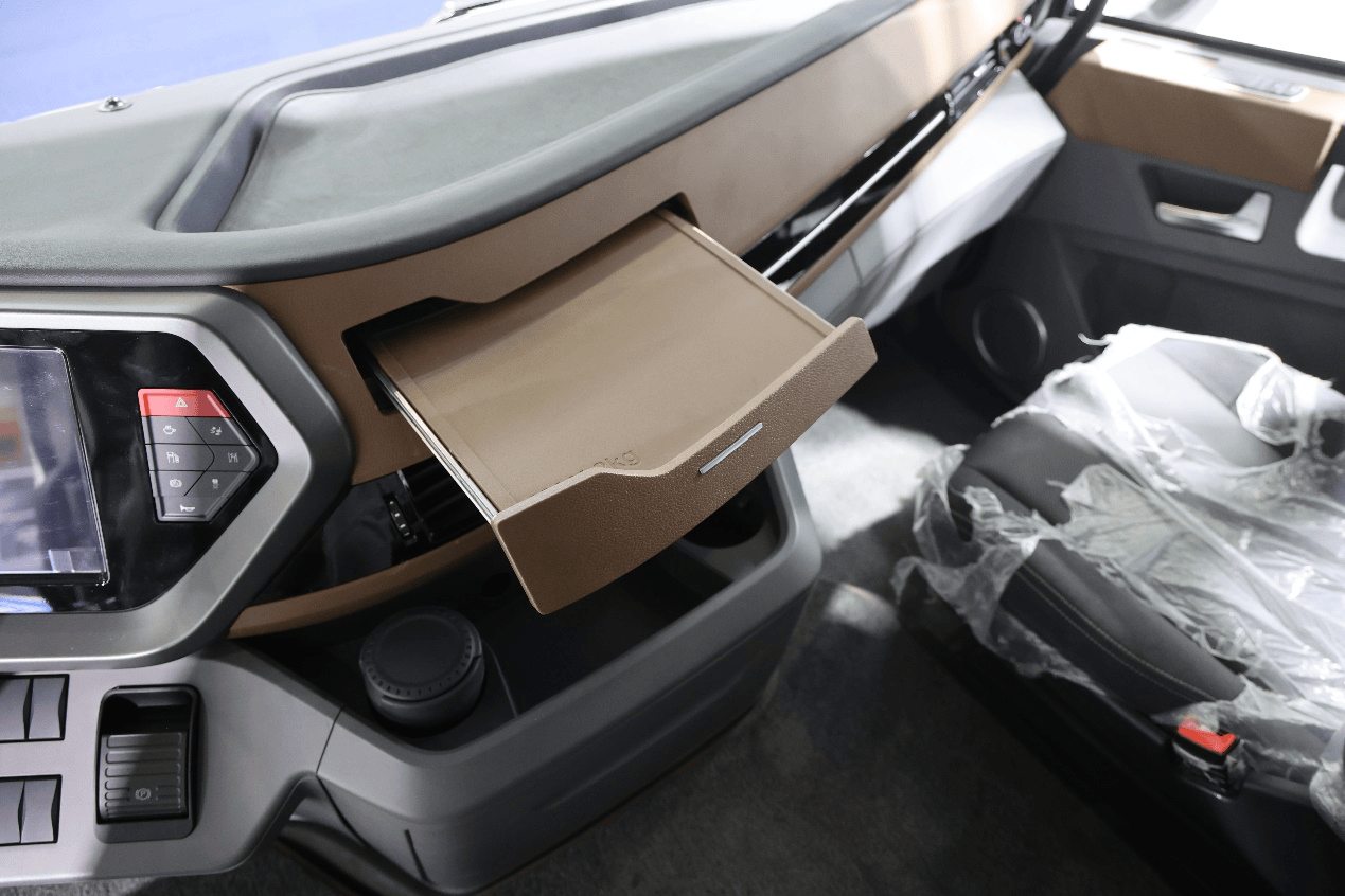 驾驶室内是东风打造的智能座舱,液晶仪表+液晶大屏,方向盘采用多功能样式,工作台环绕造型,还有自动空调、电子手刹、怀挡换挡等配置。为了符合欧洲人的使用喜欢,东风天龙GX还可以选配酒精锁、盲区提示器等配置。